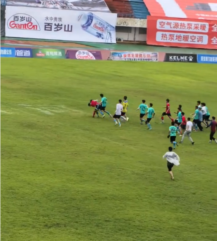 8月15日,有球迷发布视频称:在河南漯河举行的一场业余足球联赛中,蓝队球员带球过人时,有红队球员防守摔倒,裁判吹了防守犯规,结果引发双方冲突。事后多名蓝队球员追逐一名红队球员,从视频看双方有多名球员都动了手,比赛也因此中断。有球迷评价:“这简直就是‘大乱斗’啊。”